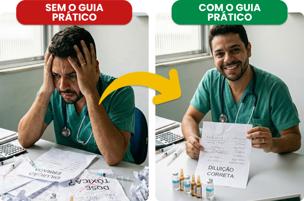 Investir R$ 67,00 no Guia Prático de Cálculos e Diluições e ter um protocolo direto e aplicável que te dá a segurança de que você está fazendo o certo em menos de 10 minutos. Agir com domínio, se tornar referência e colocar o foco no que importa: o paciente.